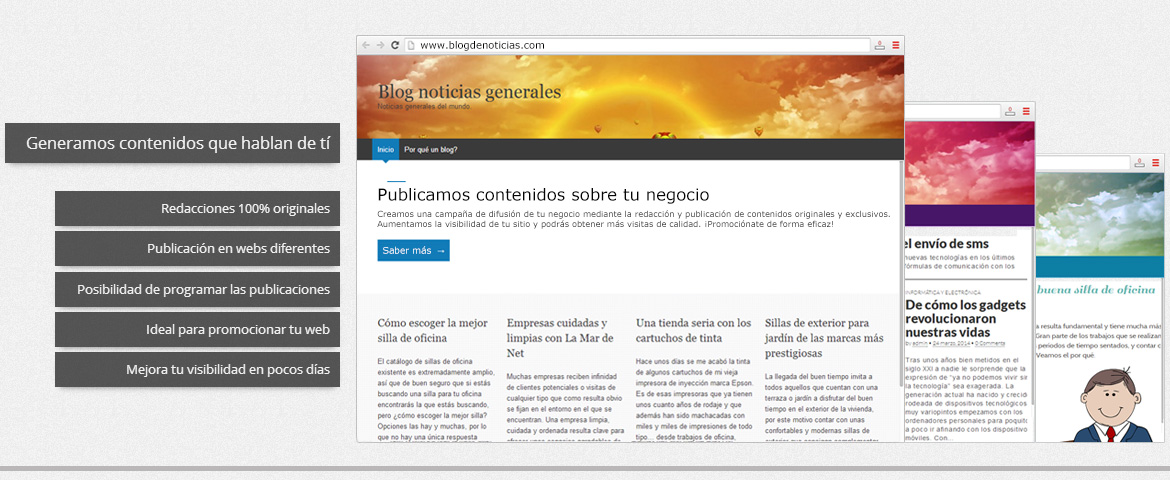 Generamos contenidos únicos sobre tu sitio y lo difundimos en blogs para darte mayor presencia